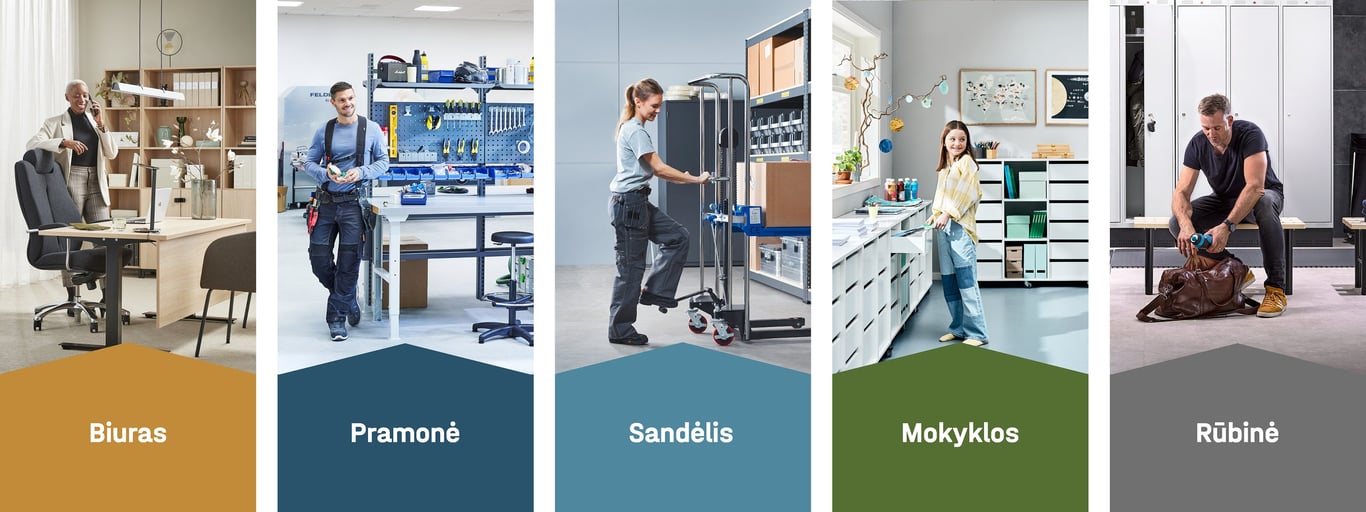 Mūsų asortimentą sudaro kiekvieną darbo dieną patogesne darantys baldai, įranga bei interjero sprendimai. Siūlome rinktis iš daugiau nei 15 000 biurams, pramonei, sandėliams, rūbinėms, mokykloms ir viešosios aplinkoms skirtų produktų. Visa mūsų produkcija greitai ir patogiais pasiekiama tinklapyje ir skaitmeniniuose kataloguose. Projektinių pardavimų skyrius gali pasiūlyti individualius darbo aplinkos poreikius atitinkančius produktus ir sprendimus - susisiekite su mūsų specialistais.