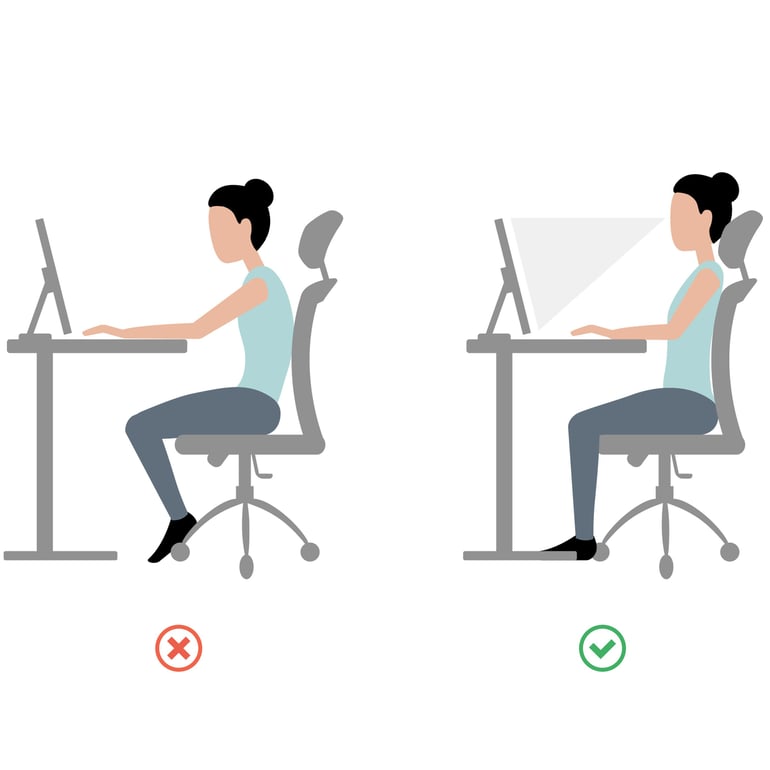 Taisyklinga sėdėsena. Įsitikinkite, kad kėdė suteikia pakankamą atramą nugarai ir kaklui. Sureguliuokite kėdės aukštį taip, kad pėdos remtųsi į grindis, o rankos patogiai gulėtų ant stalo. Esant poreikiui, naudokite kaklo atraminę pagalvėlę papildomai paramai.