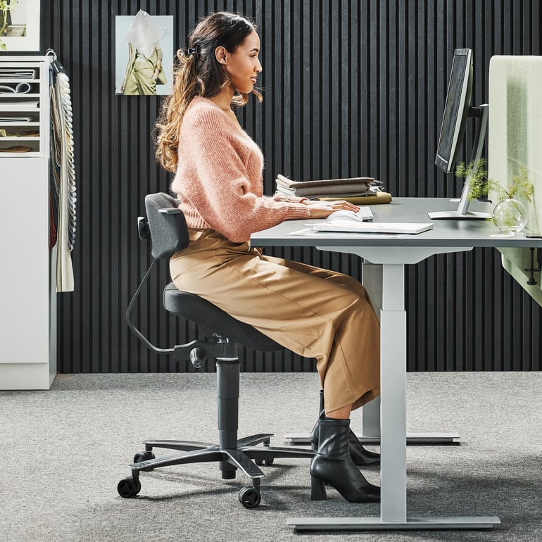 Reguliuojamo aukščio stalas suteikia galimybę keisti darbo poziciją iš sėdimos į stovimą skatina kraujotaką ir gerina bendrą ergonomiką. Norėdami maksimaliai sumažinti įtampą rankose, pečiuose ir nugaroje, naudokite stovėjimo kilimėlį ir porankius.