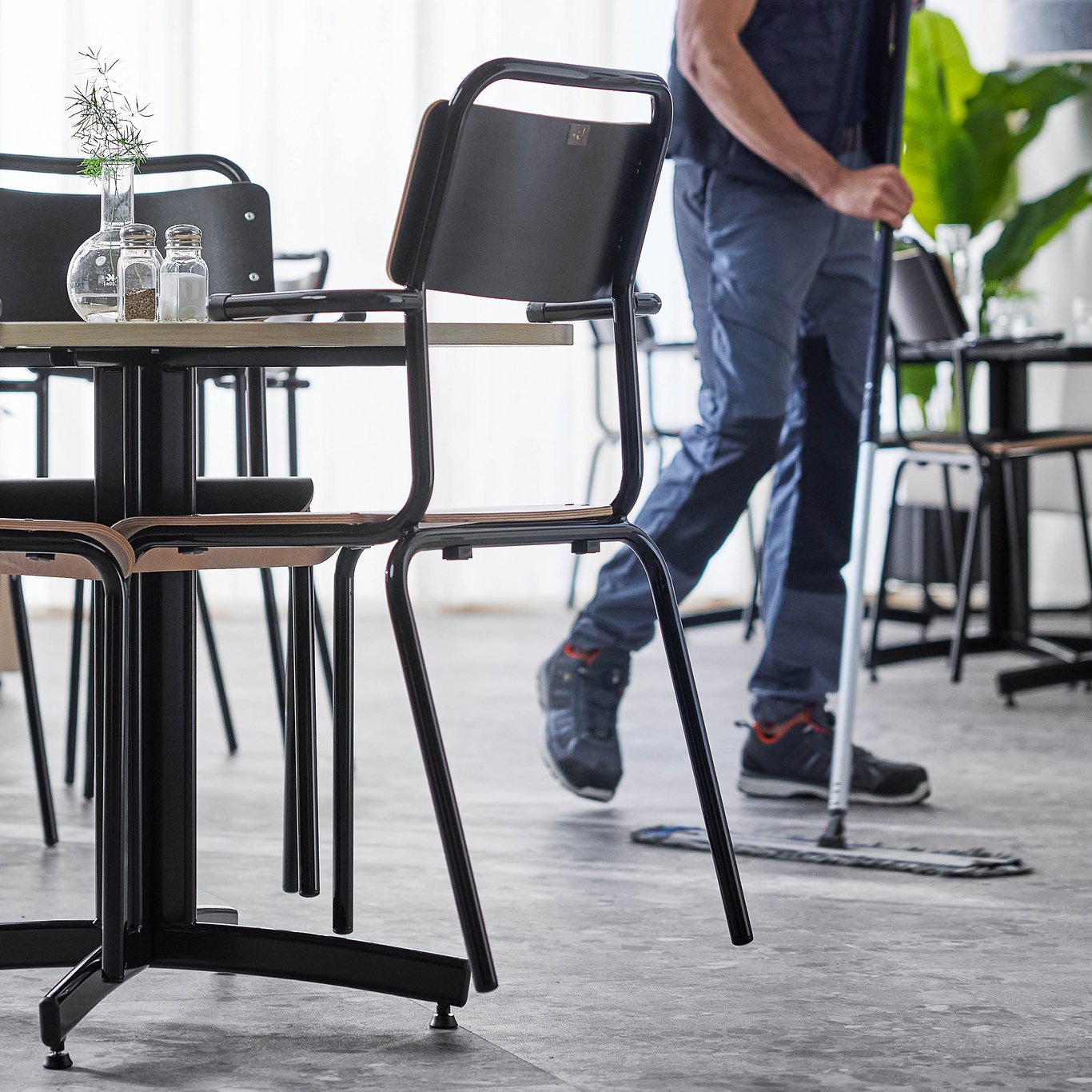 - Kėdė su porankiais BENSON – patogiai pakabinama ant stalo, kad būtų lengviau išvalyti grindis.