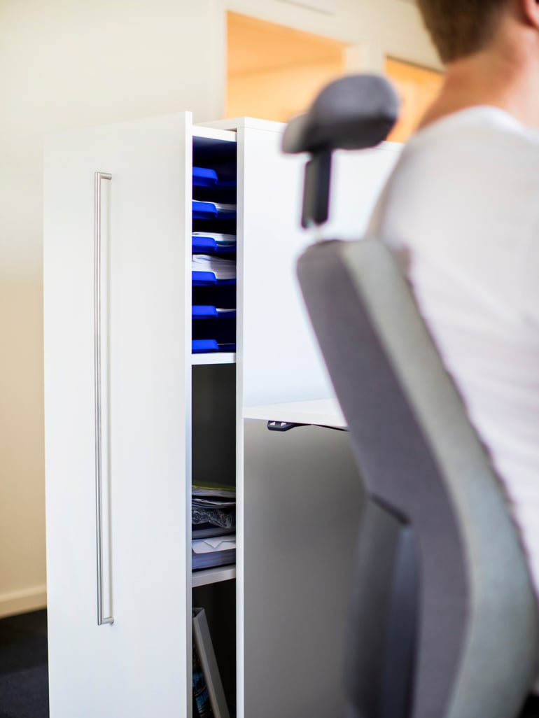 – Reguliuojamo aukščio stalai ir patogios biuro kėdės buvo akivaizdus pasirinkimas darbo vietoms, – teigia Roger. Taip pat buvo pasirinktos spintos su stumdomomis durimis ir šoninės spintelės, kurios atsidaro trumpąja kraštine. Tai taupo vietą, o šoninės spintelės taip pat atlieka pertvarų funkciją. Patalpose yra kelios jaukios poilsio zonos, kuriose darbuotojai ir lankytojai gali atsipalaiduoti.